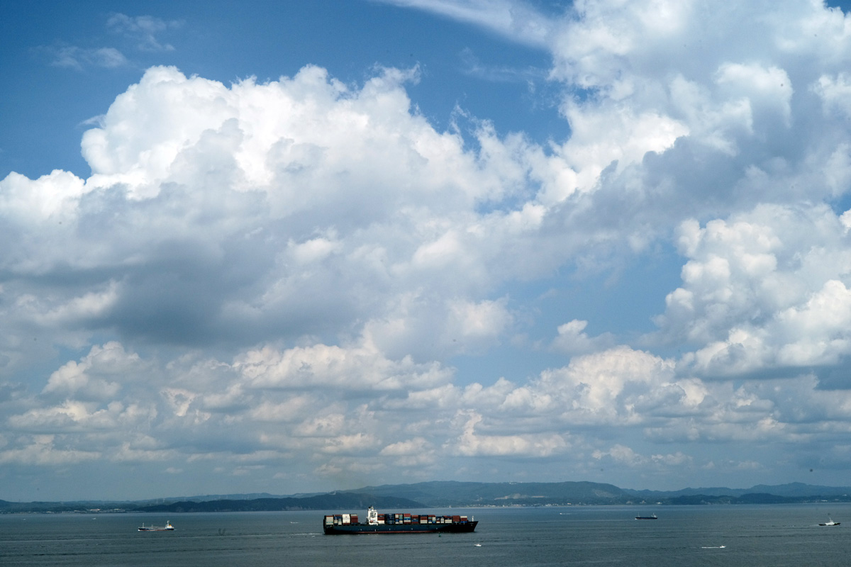 ▼外洋に向かうコンテナ船