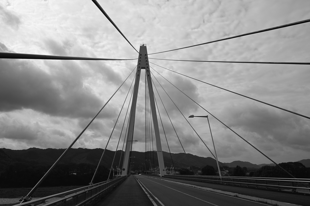 ・白い大きな斜張橋。橋長 532m。