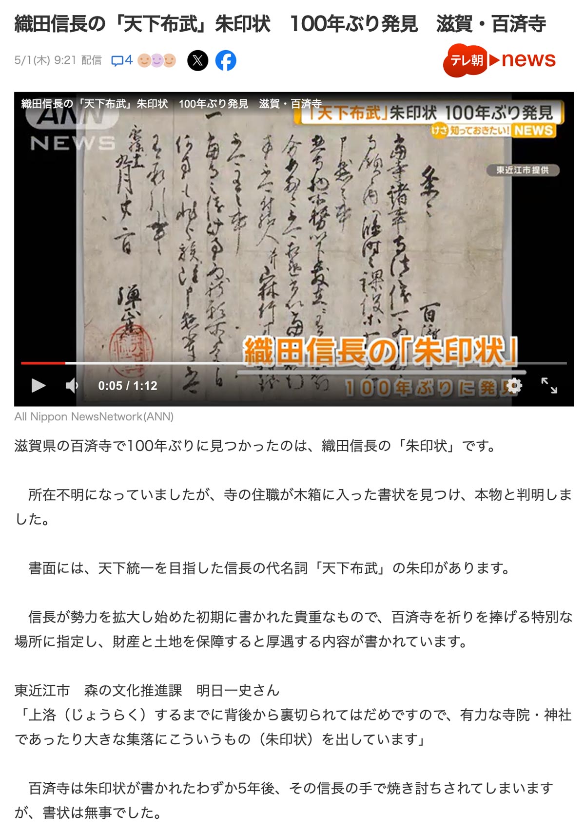 ・ここを記していたら、信長の「天下布武」の朱印状が百済寺で発見されたとのニュースが飛び込んできた。あんまりなタイミングだ。