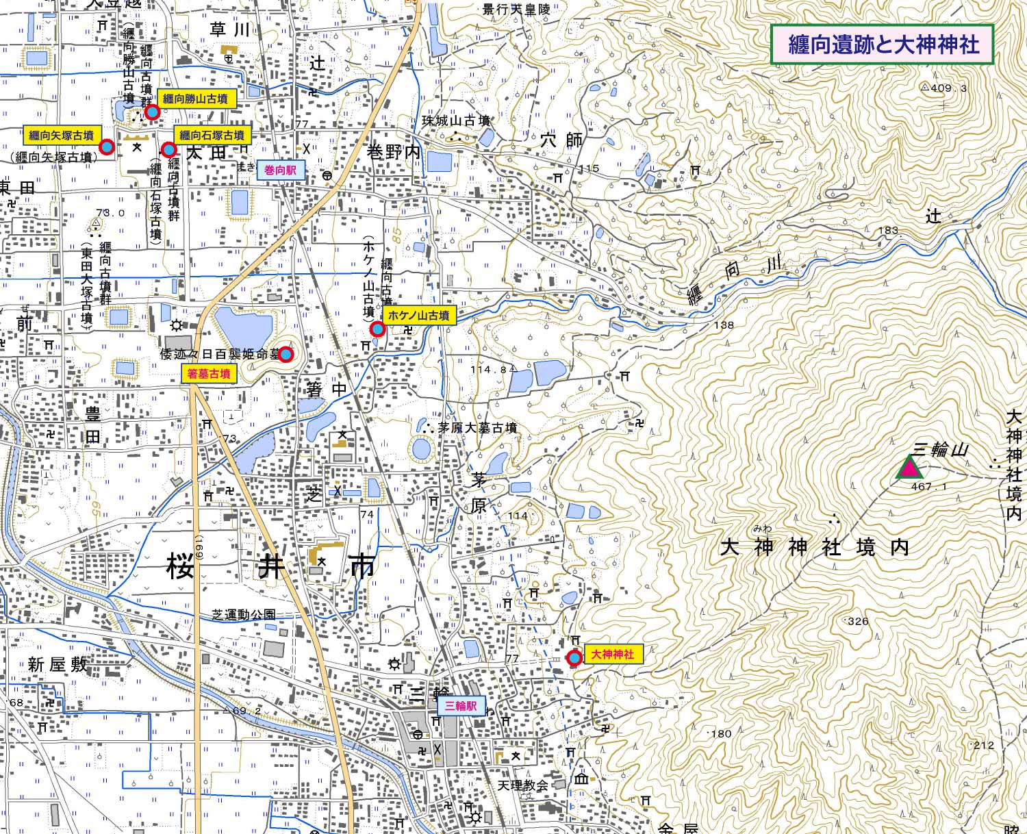 ・大神神社の表示が目立つ。