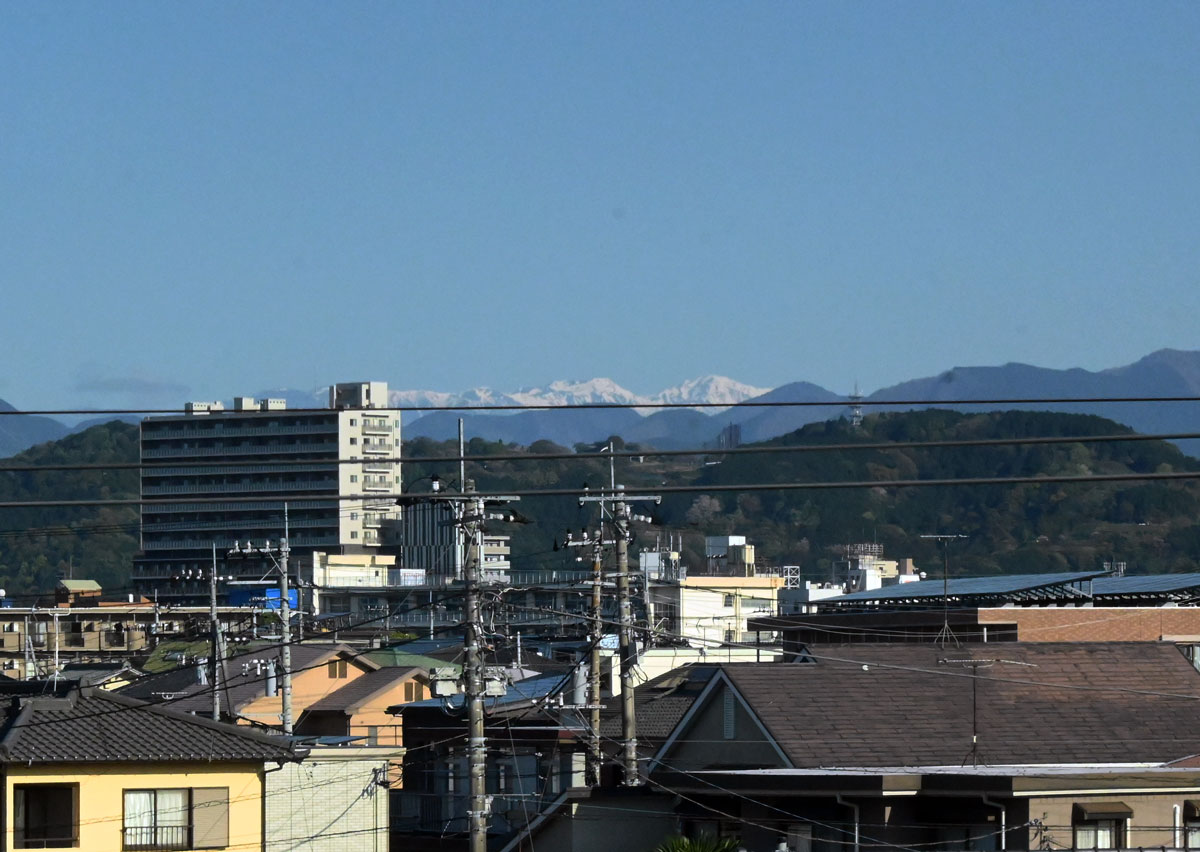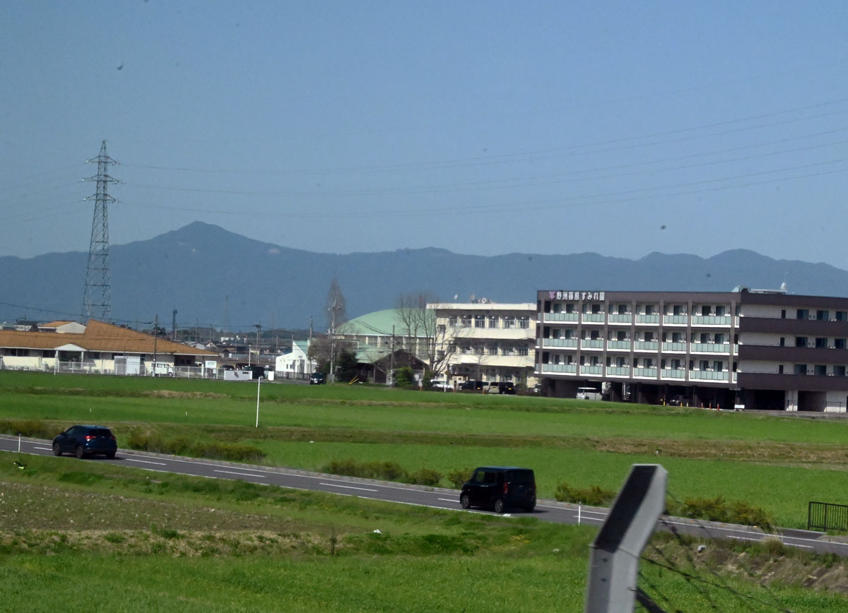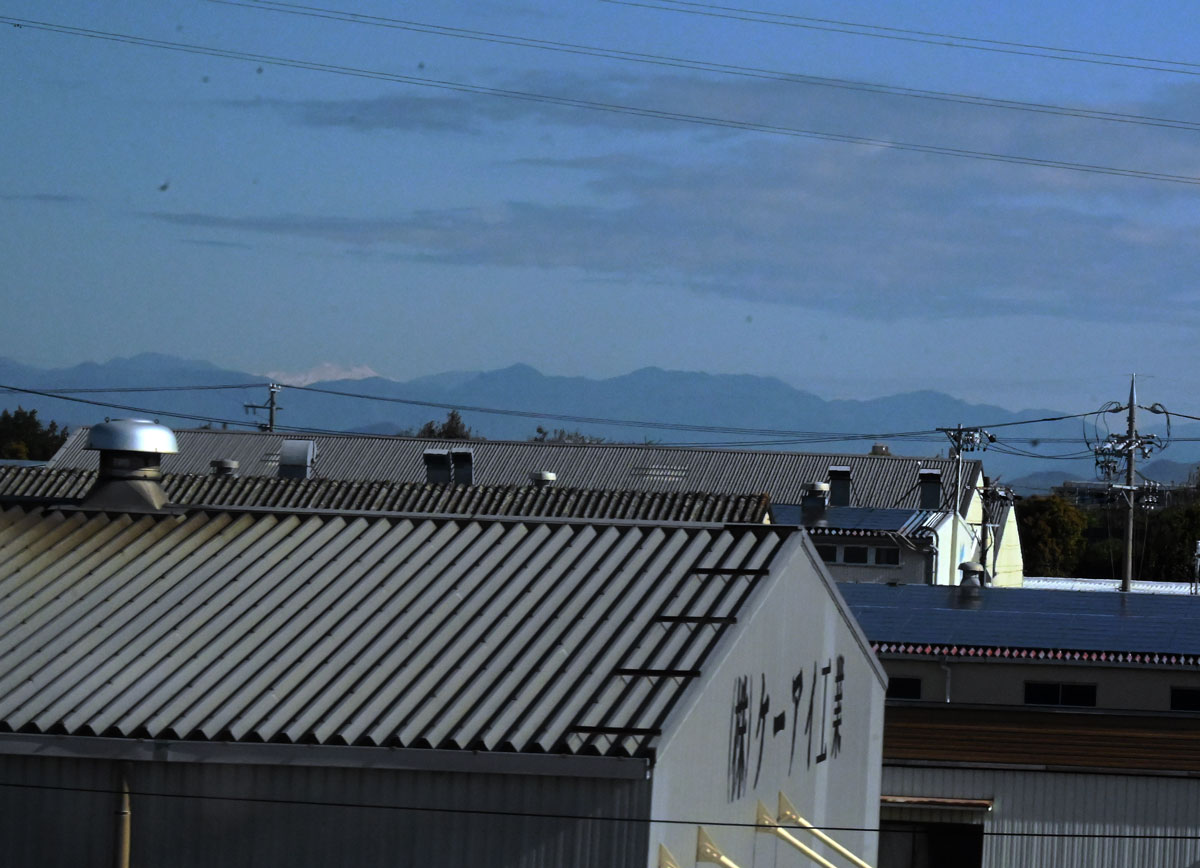 ・岐阜羽島の手前に白い山。