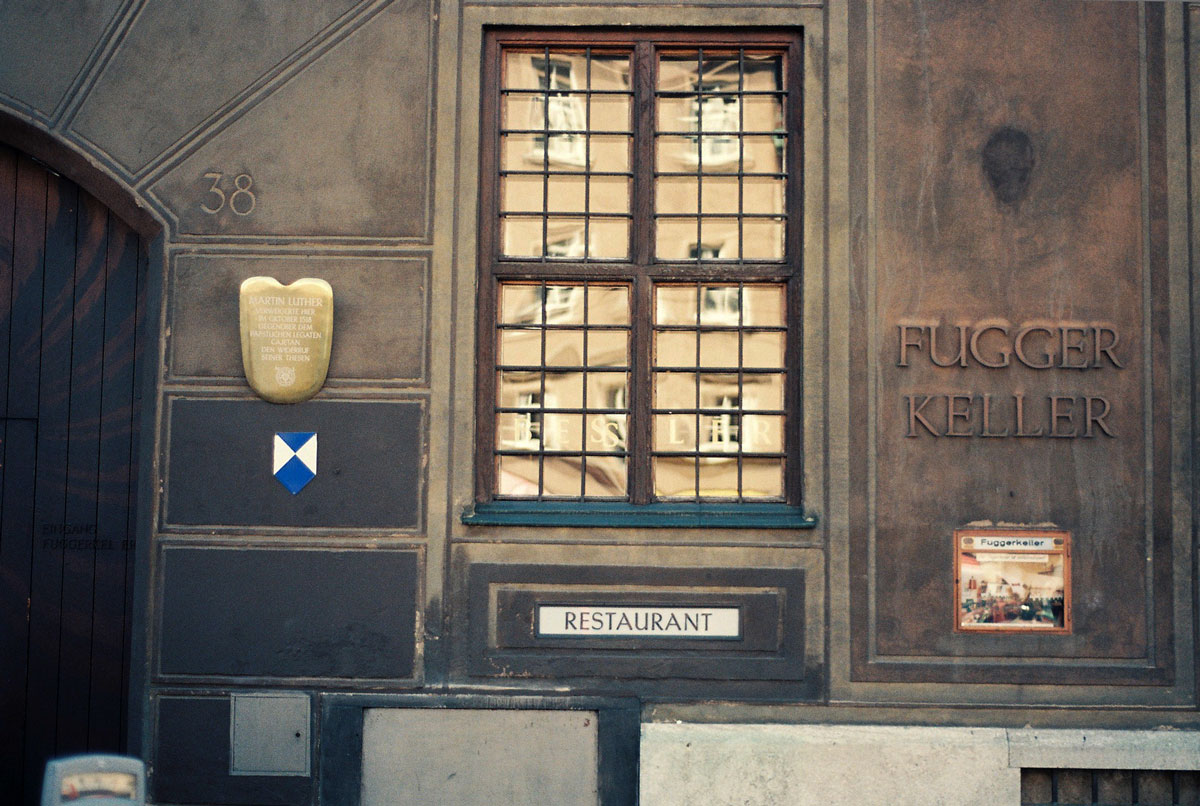 ・よく見るとフッガー家の紋章があり、奥の部分の白い文字は FUGGER KELLERとある。次の写真を参照。さらに奥の白い文字が FUGGER BANK か。
