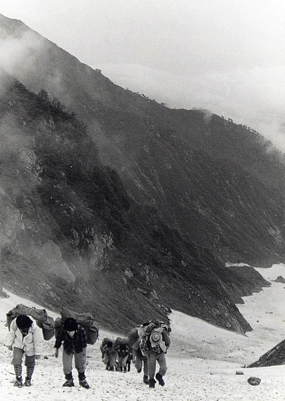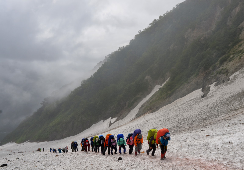 遠くで見ると雪渓は白くてきれいなのだが、実際には歩きにくい。しかも小雨の中で、重い荷物が足を滑らせる。しかし急登でも暑くはなく、高度ははかどる。