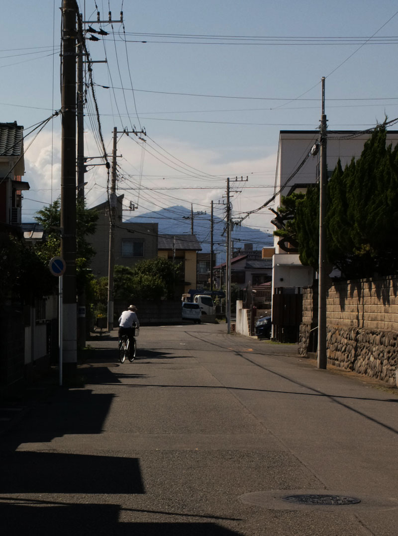 ・静かな住宅地。道の正面に大山。