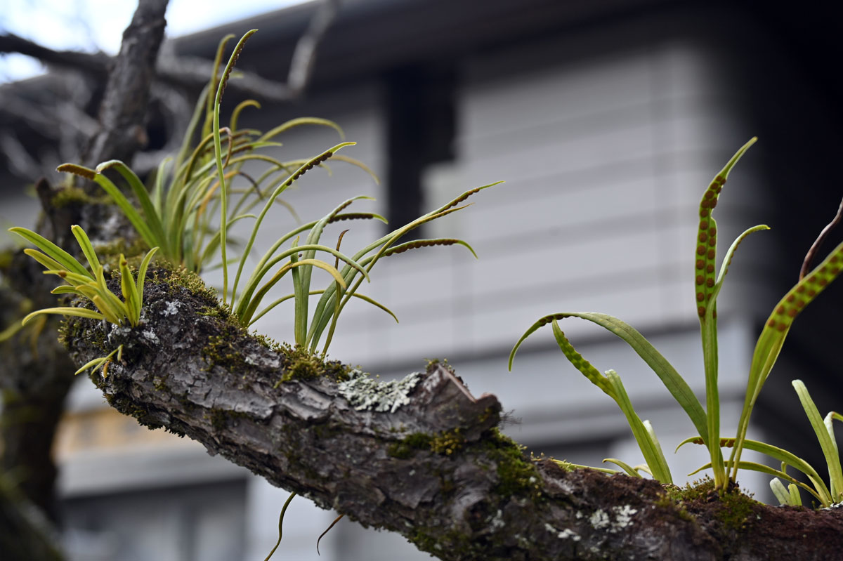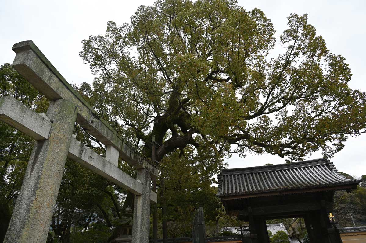 ・回廊の上にクスノキが鎮座する。