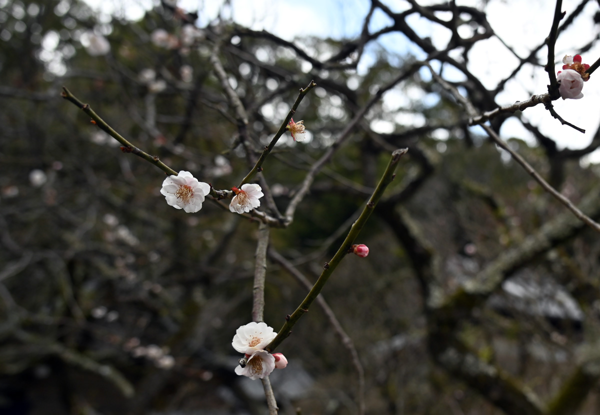 ・池の向こうに紅梅。