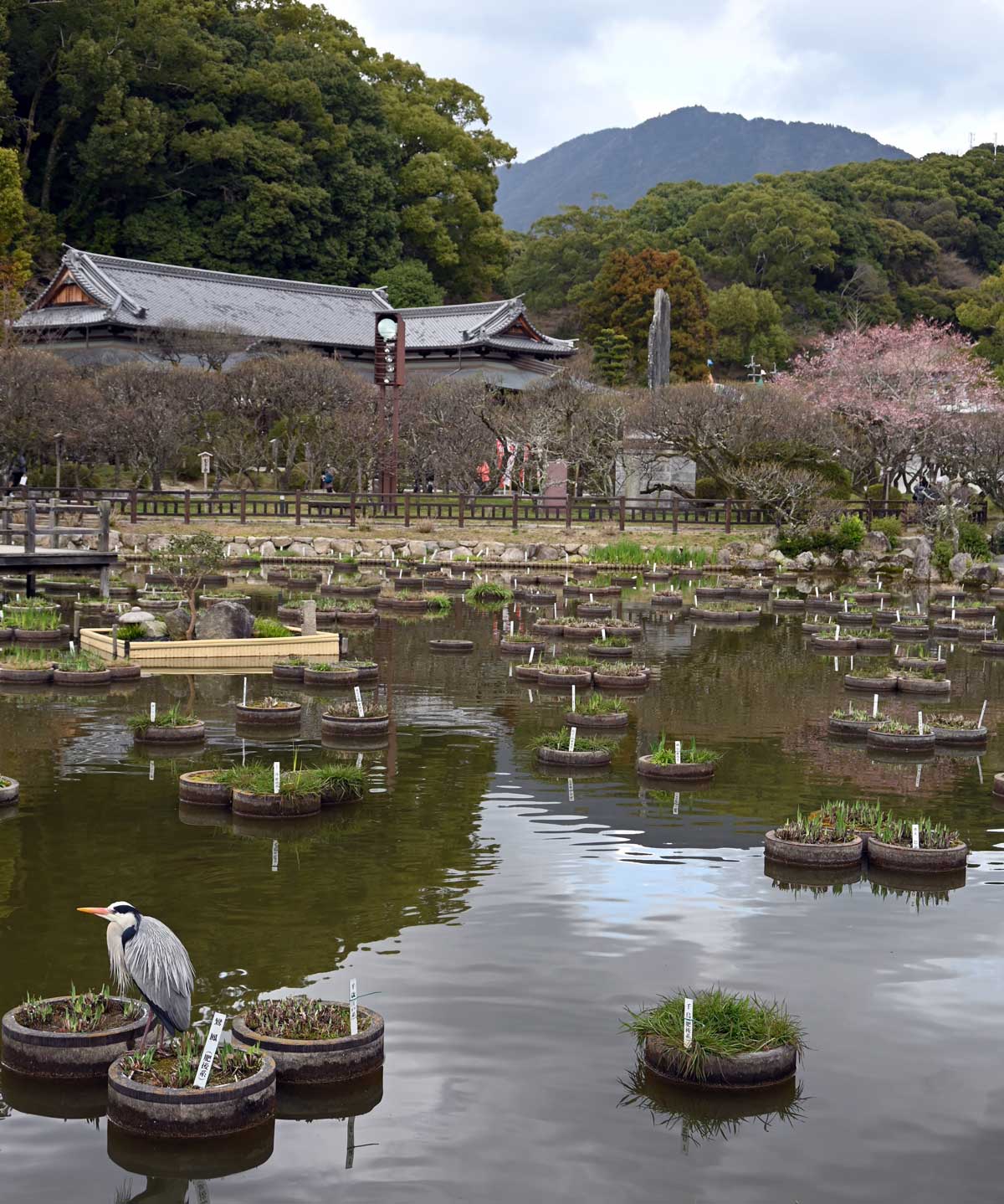 ▼菖蒲池、アオサギ、宝満山