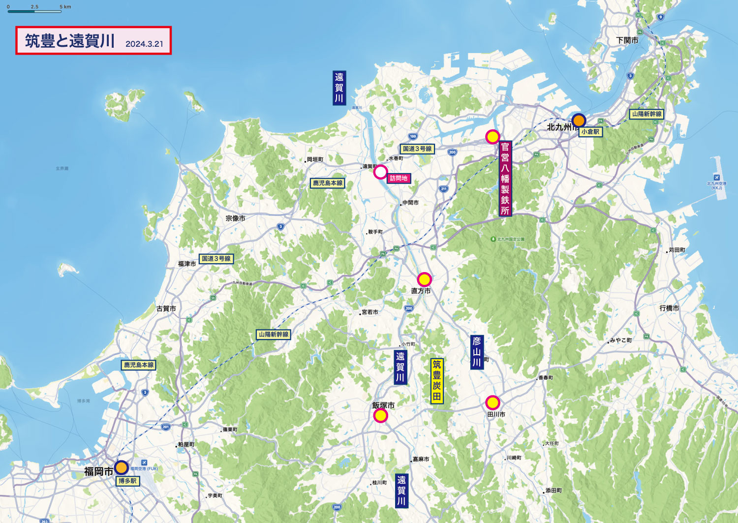 ・筑豊の石炭は遠賀川に沿って運ばれる。