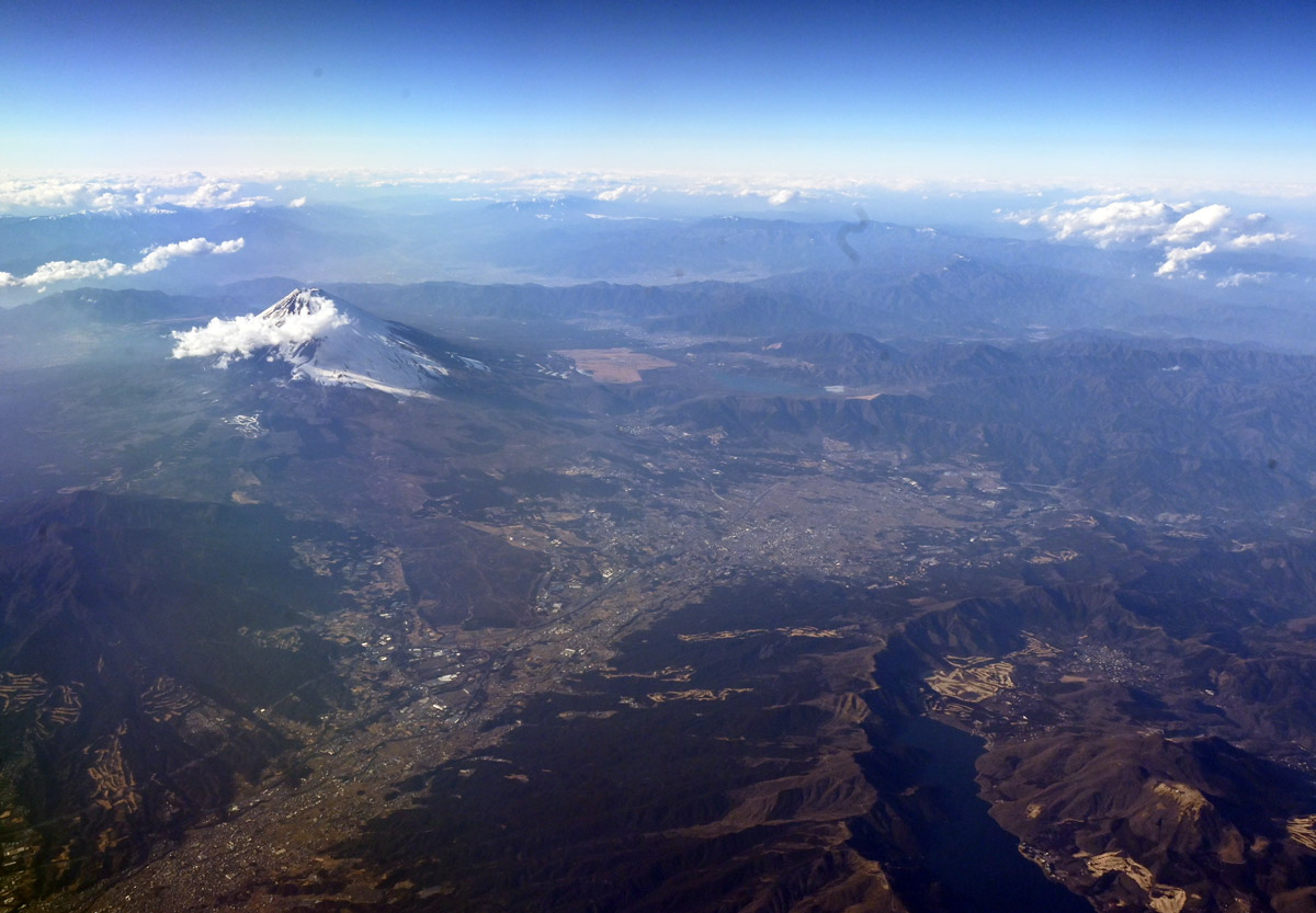 ・富士山の奥が御坂山塊。さらに甲府盆地。
