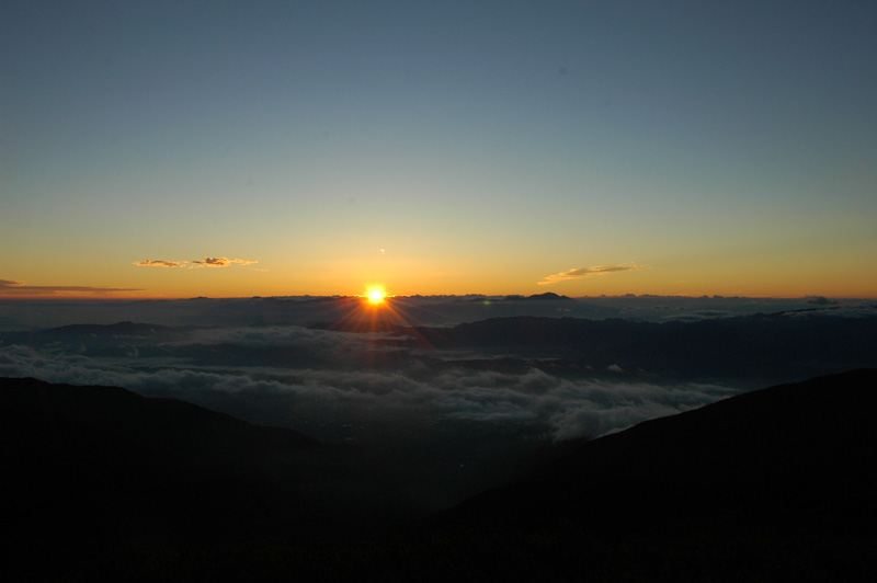 ・同日の朝、まだ朝焼けの状態。蝶ヶ岳の標高が2677m、奥穂高岳が3190mだから、およそ8割の高さから少し見上げることになる。これは山岳展望としては絶好の位置らしい。