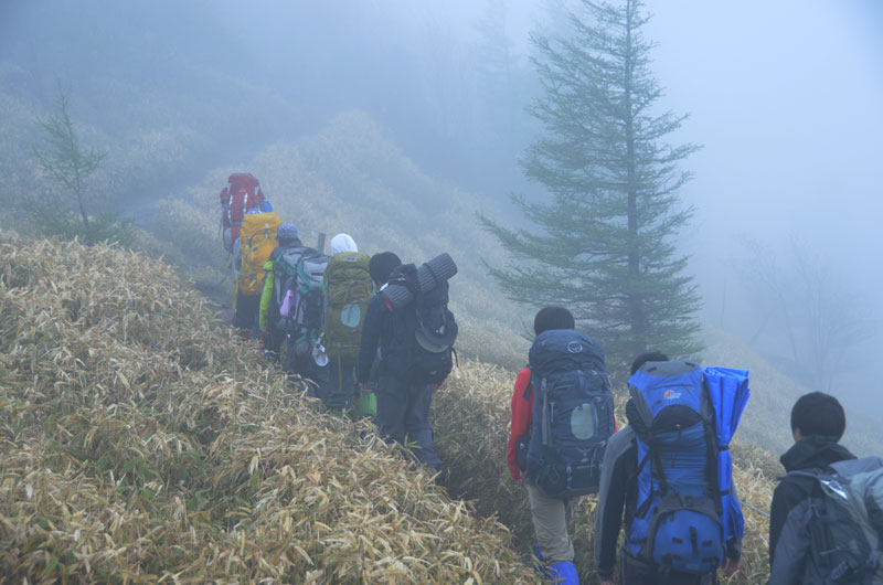 遠くで見ると雪渓は白くてきれいなのだが、実際には歩きにくい。しかも小雨の中で、重い荷物が足を滑らせる。しかし急登でも暑くはなく、高度ははかどる。